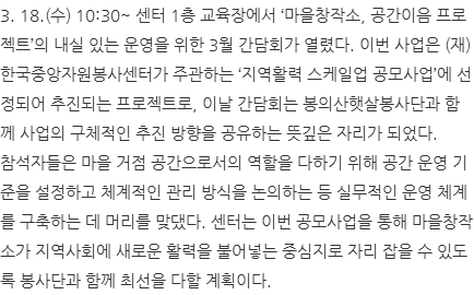 이날 회의에는 운영위원 11명을 비롯해 시 지역공동체팀 관계 공무원과 센터 관계자들이 참석하여, 지난 성과를 돌아보고 센터의 내실 있는 운영 방안에 대해 심도 있는 논의를 펼쳤다.