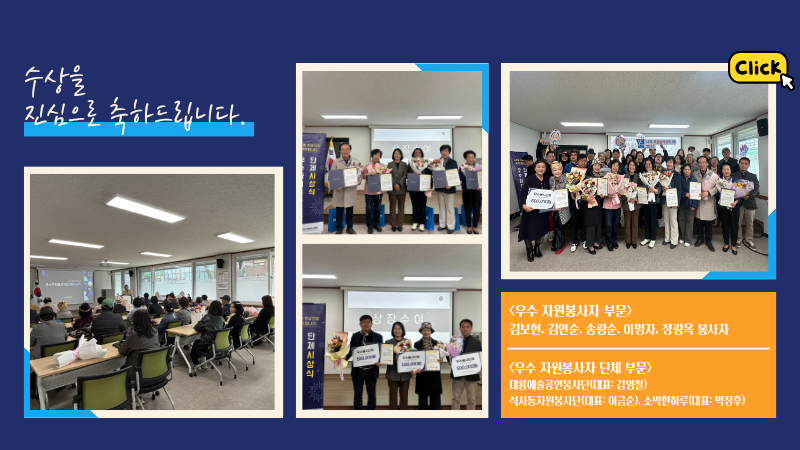 3 27.(금) 11:00~ 센터 1층 교육장에서 지역사회 곳곳에 따뜻한 변화를 만들어온 자원봉사자와 단체를 격려하기 위한 시상식이 개최되었다.